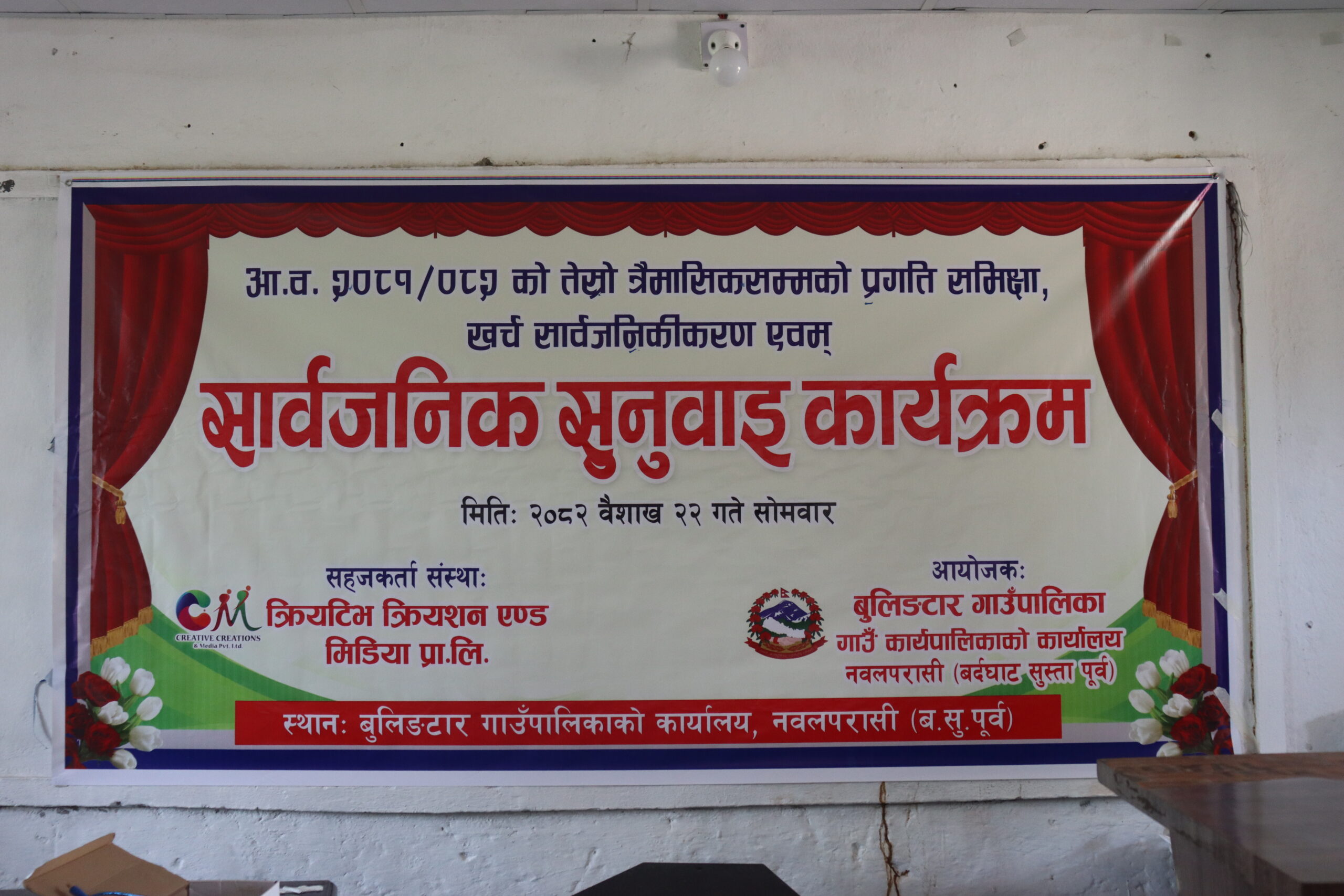 बुलिङटार २७ बैशाख ।बुलिङटार गाउँपालिकाको आयोजनामा गाउँपालिकाको सभा हलमा आ.व. २०८१/०८२ को तेस्रो त्रैमासिक प्रगति समीक्षा, खर्च सार्वजनिकरण तथा सार्वजनिक सुनुवाइ कार्यक्रम भव्य र सभ्य रूपमा सम्पन्न भएको छ ।